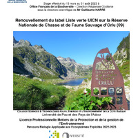 - Située au coeur du massif des Pyrénées ariégeoises, la Réserve Nationale de Chasse et de Faune Sauvage d’Orlu souhaite renouveler son label Liste verte UICN obtenu en 2018. Ce label international récompense les aires protégées justifiant d’une gestion exemplaire. Pour obtenir de nouveau ce label, une autoévaluation de la réserve selon certains critères doit être réalisées. Ils sont répartis en quatre thématiques : la planification, la gouvernance, l’évaluation et les résultats. Cette autoévaluation a démontré que la réserve remplissait la plupart des critères et qu’une évolution a été marquée depuis le passage de l’ONCFS à l’OFB en 2020. En effet, cela a entraîné une diversification des thématiques d’actions sur la réserve, notamment les aspects sur les zones humides (protocole RhoMéO). La RNCFS démontre cependant certaines faiblesses côté communication mais l’OFB montre une volonté d’amélioration de ce volet là à travers notamment le nouveau plan de gestion 2024-2033. À cette autoévaluation s’ajoute un tableau de bord servant à suivre et à évaluer les valeurs principales de la réserve sur le long terme. Ce tableau servira à suivre l’état de conservation des espèces faunistiques emblématiques de la réserve que sont l’Isard (Rupicapra pyrenaica pyrenaica), le Grand tétras (Tetrao urogallus aquitanicus) mais aussi d’autres espèces patrimoniales telles que le Desman des Pyrénées (Galemys pyrenaicus) ou le Calotriton des Pyrénées (Calotriton asper). Un volet est aussi consacré aux services écosystémiques rendus par la réserve (zones humides) et à ses valeurs culturelles (accueil du public).