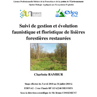 Les observations de terrain sur ces 8 lisières restaurées, ont permis de mettre en évidence une évolution positive de l’étagement des lisières sur un tiers des transects seulement. Les inventaires faunistiques et floristiques ont montré une augmentation importante depuis 2015 de la biodiversité des plantes ligneuses et des lépidoptères alors que celle des plantes herbacées et des odonates semble stable. Des analyses uni- et multivariées ont permis de montrer que la faune et la flore des différentes lisières ont fortement évolué entre 2015 et 2018, et que cette évolution a été différente d’un site à l’autre. L’étagement de la majorité des lisières ne correspondant pas aux attentes lors des travaux de restauration de 2012-2013, il semble nécessaire d’apporter des améliorations au niveau de la gestion des lisières en s’inspirant de celles avec un bon étagement et en réalisant éventuellement de nouvelles coupes appropriées d’arbres pour casser la linéarité des lisières. Différentes opérations d’entretien régulier semblent également indispensables comme la lutte contre le développement important des ronces, ou la surveillance des espèces invasives. - Discipline principale