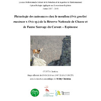 - La phénologie des naissances est un élément important pour la survie des grands herbivores puisqu’elle conditionne la survie de la descendance, donc la dynamique des populations. La date moyenne des naissances de 2001 à 2016, calculée pour le mouflon méditerranéen (Ovis gmelini musimon x Ovis sp.) sur la Réserve de Chasse et de Faune Sauvage du Caroux-Espinouse, montre une variation de la date des naissances d’année en année. Ainsi, différentes variables environnementales ont été testées afin de comprendre quels sont les mécanismes qui régissent les dates de parturition chez le mouflon. La sécheresse de l’été précédent les naissances, influe de façon significative sur la condition physique des femelles donc sur les dates de mise bas au printemps suivant. Cependant, les dates de début d’automne l’année précédent les naissances, et de début du printemps l’année des naissances, n’auraient pas d’impact sur les mises bas. Ces résultats permettront de prédire l’arrivée des naissances en fonction des facteurs environnementaux, et ainsi développer des mesures de gestion adaptées.
